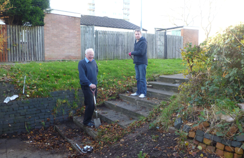 Popular local Cllrs Robert Alden, Gareth Moore and Bob Beauchamp spent the afternoon pitching in with members of St Margaret’s Church, Jarvis Road, Erdington on a cleanup of the land around the Church and the alley between Jarvis Road and Somerset Road. The clean up cleared leaves, rubbish and over grown bushes from the alley and grass that had grown over the path to the alley. After this a series of small trees were planted in the flower bed to the side of the alley to smarten it up. Over 40 bags of rubbish were collected and helpers enjoyed hot pork baps afterwards in the Church.